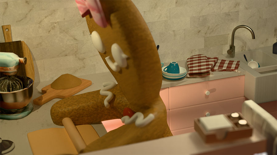 Wir haben die Aufgabe erhalten, innerhalb von zwei Monaten einen eigenen Film mit dem Programm Blender zu erstellen. Wir haben in einer Gruppe von drei Personen gearbeitet und die Aufgaben unter uns aufgeteilt. Ich habe die Objekte und den Kuchen modelliert. Außerdem war ich dafür verantwortlich, den Lebkuchenmann, für meine Szenen, zu animieren. Am Ende haben wir alles gemeinsam animiert und gerendert.